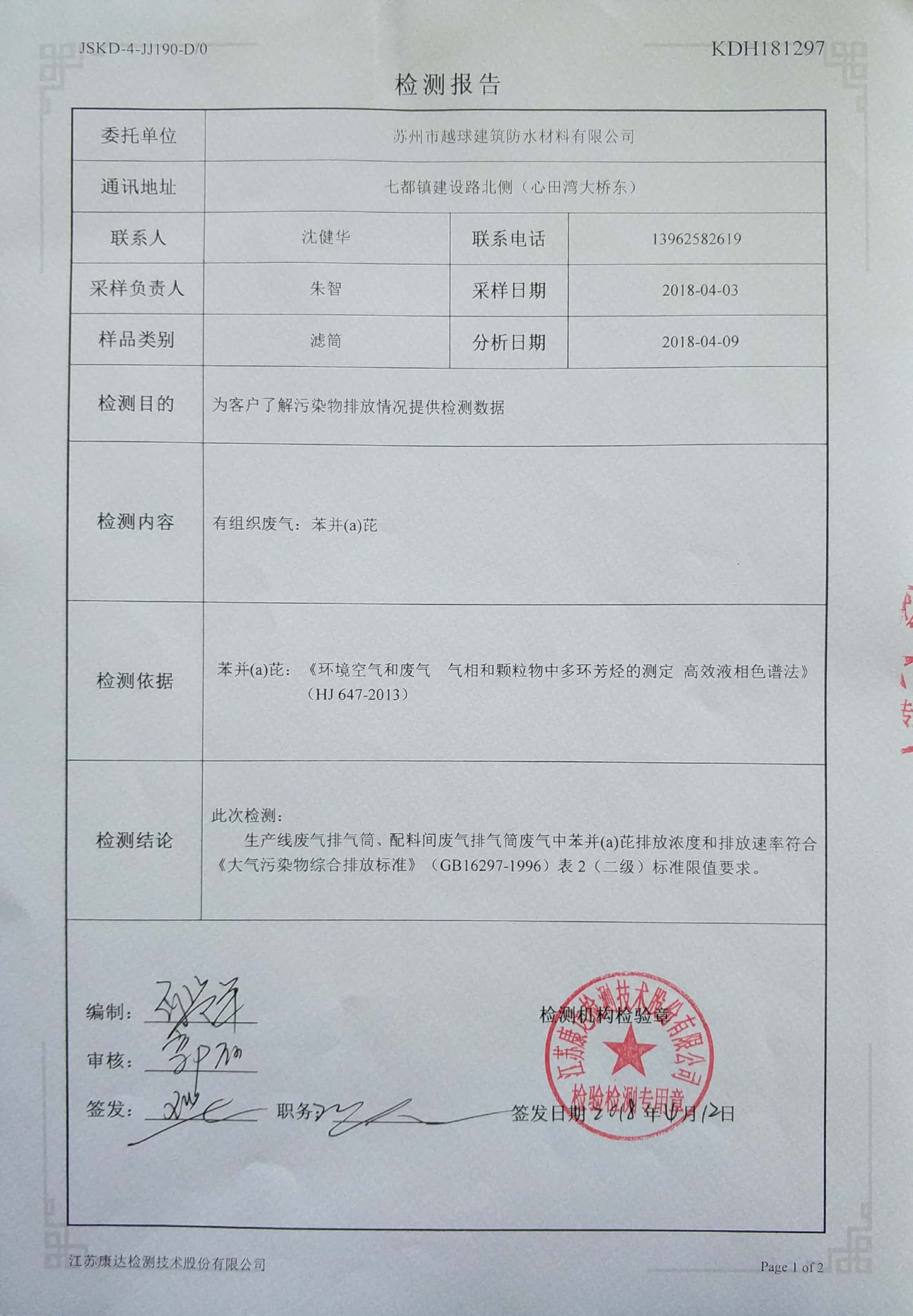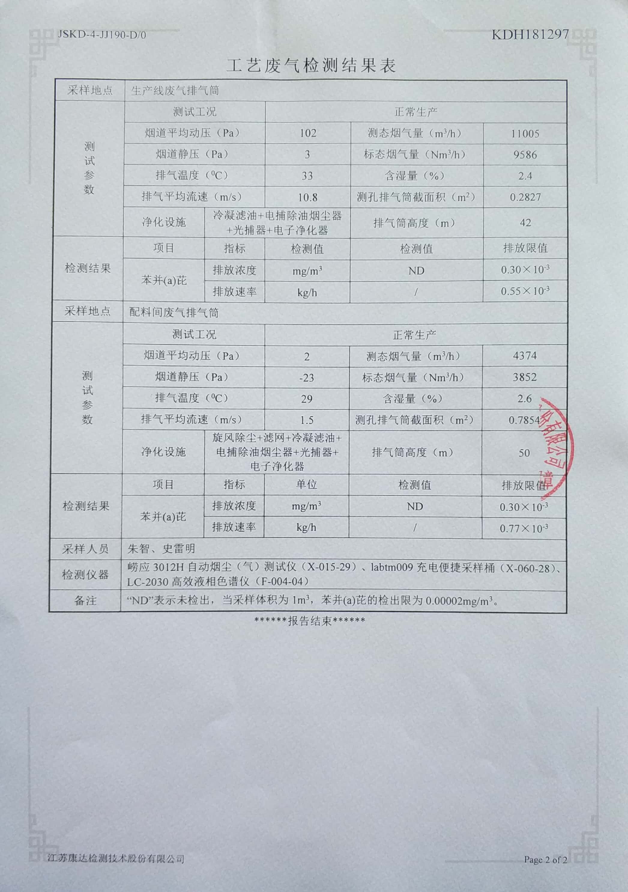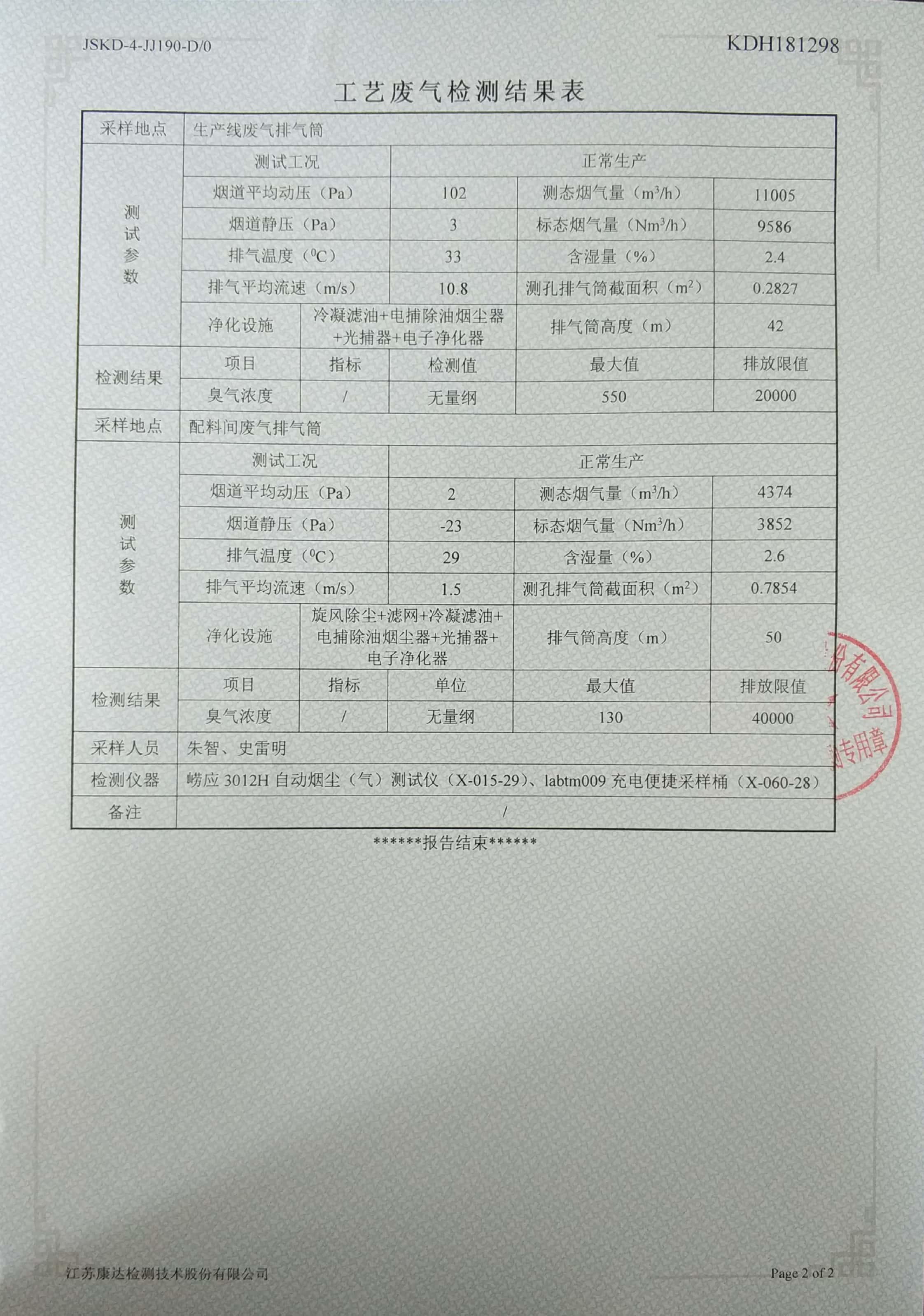 2018-4-3我司委托江蘇康達(dá)檢測技術(shù)有限公司對工藝廢氣進(jìn)行檢測,報告如下